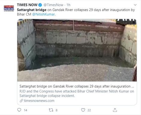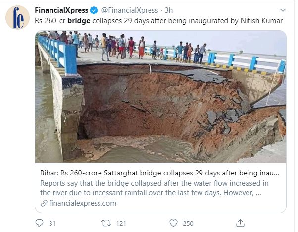 Priyanka Jha posted: "On July 16, the country woke up to the news of Sattarghat bridge in Bihar collapsing a month after it was inaugurated. Flooding in Gandak river damaged the bridge reportedly built over a span of eight years at a cost of Rs 264 crore. The bridge was inaugu"
