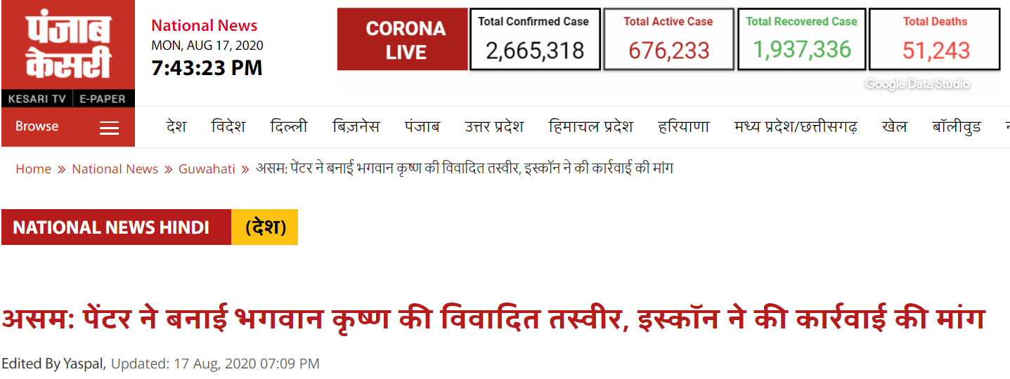On August 17, News Nation anchor Deepak Chaurasia tweeted that Akram Hussain, a painter in Assam, exhibited an offensive picture of Hindu deity Krishna in a Guwahati art gallery. "I'm sure you all remember Bengaluru riots, but we are the ones termed intolerant," wrote Chaurasia. As of this writing, his tweet drew over 9,000 likes and more than 3,000 retweets.