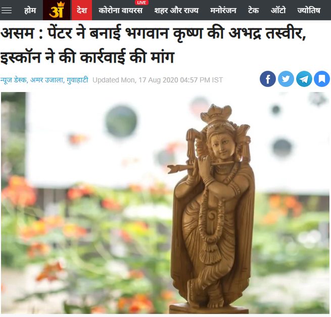 Prior to Chaurasia's tweet, Krishna's derogatory painting was tweeted by NewsX anchor Shehzad Poonawallah who tagged the DGP of Assam and the Chief Minister's Office to take action against Hussain. The same was tweeted by ISKCON Long Island, New York. ISKCON Kolkata vice-president and spokesperson Radharamn Das requested BJP MLA Himata Das to arrest Hussain.