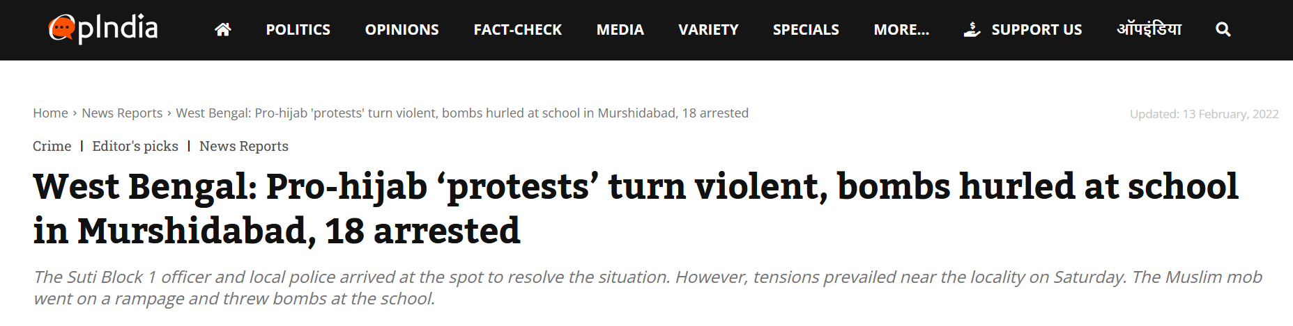 On February 12, it was reported that a school in the Suti area of Murshidabad district, West Bengal was vandalised after the headmaster allegedly asked girl students not to come to school wearing hijab/burqa.