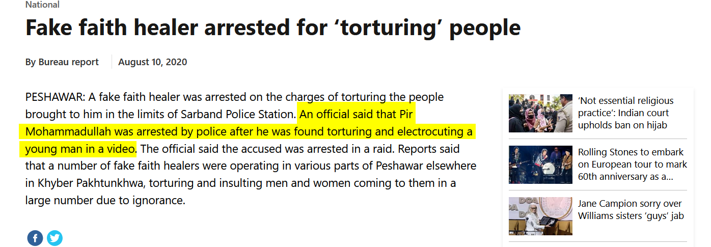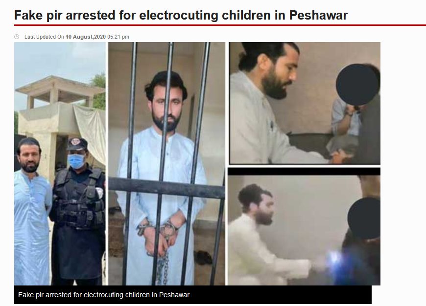 Taking this clue we performed another keyword search on Google and came across a news report from August 2020, that featured images that are similar to the viral video. As per the news report, the man in the video is Pir Mohammadullah, who was arrested by the Peshawar Police for performing an exorcism on a boy by electrocuting him.