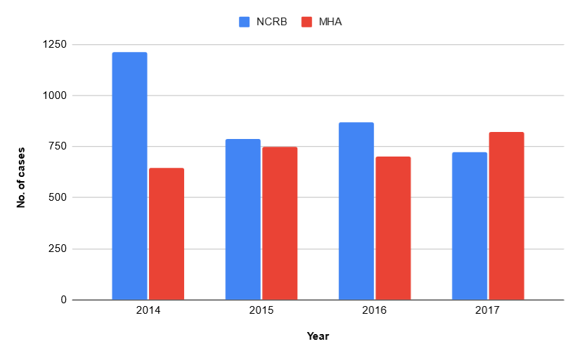 We also noticed some discrepancies when we compared the data provided by the MHA to the data provided by the NCRB. For example, as per the data by MHA, in 2014 only 644 cases of communal violence took place. But as per NCRB, the number of communal violence cases in 2014 was 1213. Again, as per the MHA, the number of communal violence cases in 2017 was 822, but when we check the data provided by the NCRB, the number is 723.