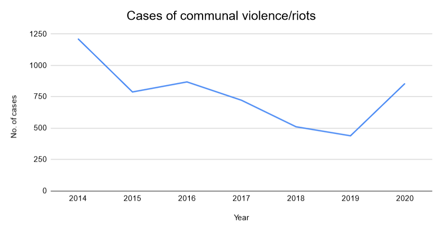We also checked the website of the National Crime Records Bureau (NCRB) which publishes a report called "Crime in India" where annual statistics on national crime are available since 1953. We checked the reports from 2014 to 2020 to see data on communal riots in the country in recent years. The data for 2019 and 2020 are not mentioned in the table, however, the data for both the years are available as separate links.