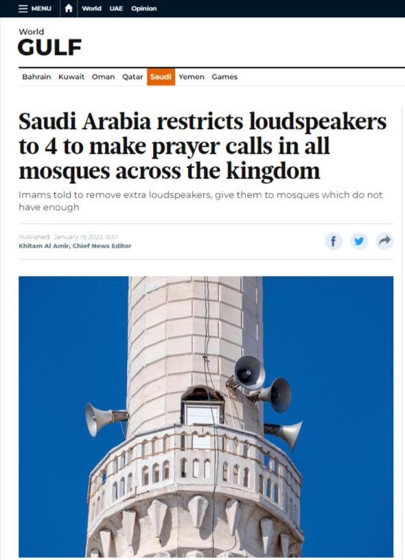 However, media reports from January this year said that Saudi Arabia had issued directives to restrict the use of loudspeakers in all mosques across the Kingdom. Gulf News wrote that the minister of Islamic affairs had set the number of external loudspeakers at four which are only to be used in mosques to make the prayer calls.