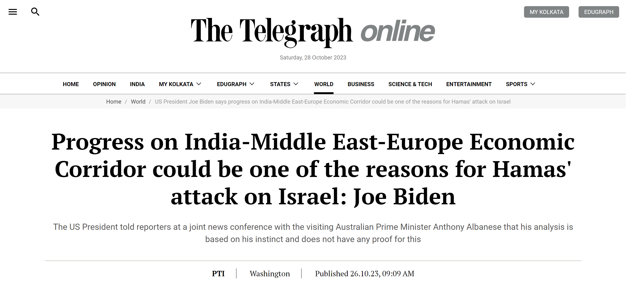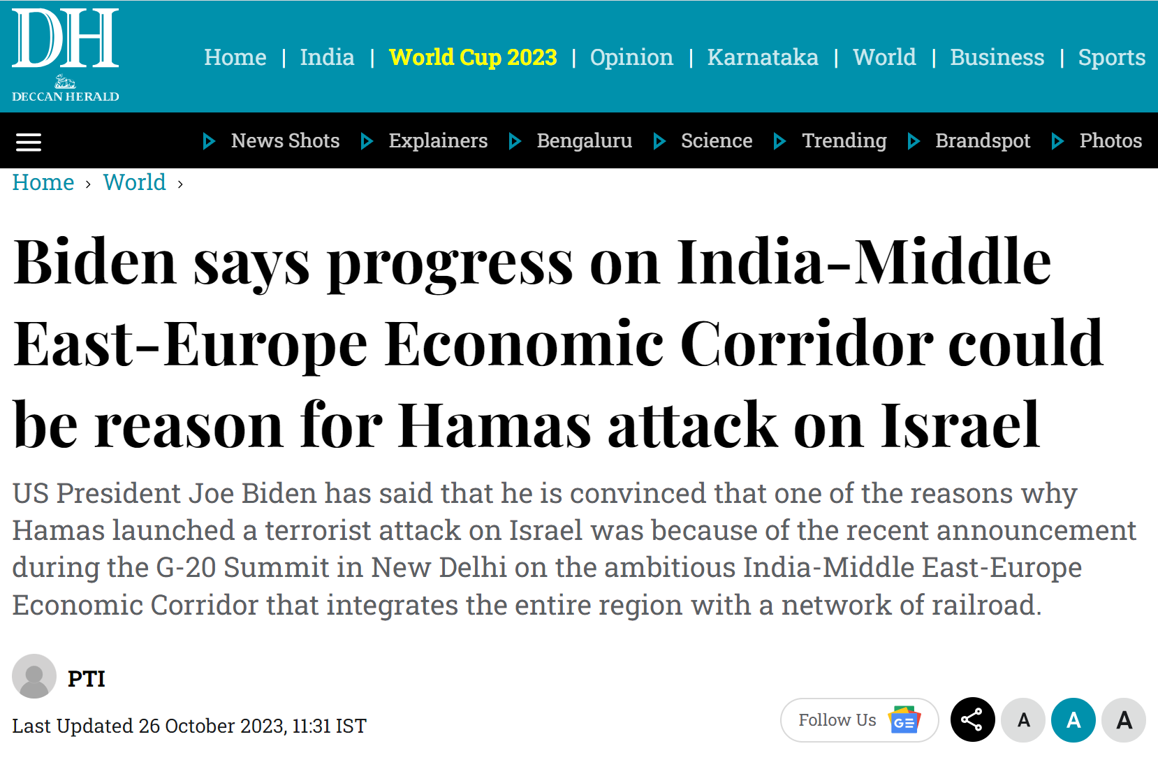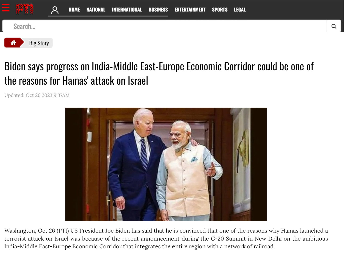 Press Trust of India (PTI)'s chief US correspondent Lalit K Jha reported that US President Joe Biden stated the progress on the India-Middle East-Europe Economic Corridor could be a possible reason for Hamas' attack on Israel.