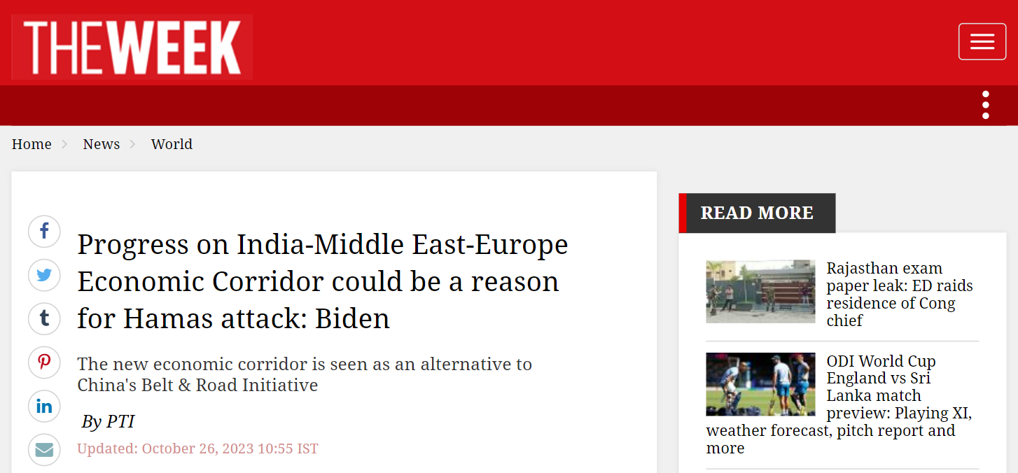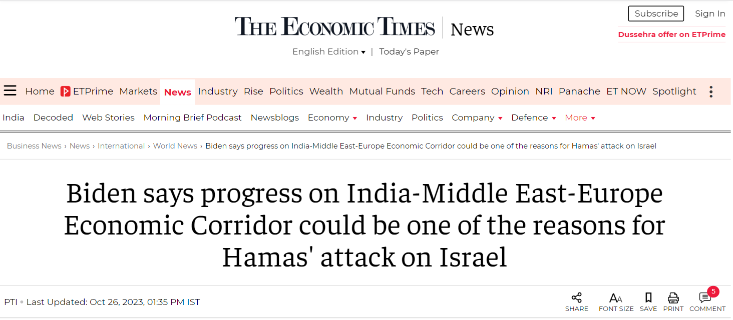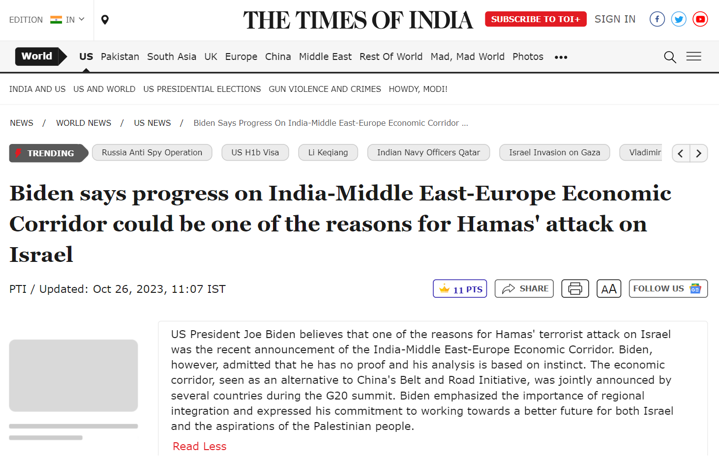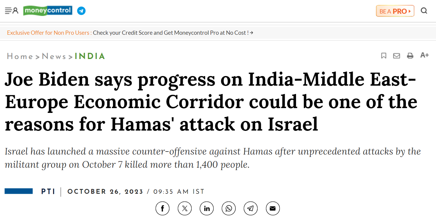 Press Trust of India (PTI)'s chief US correspondent Lalit K Jha reported that US President Joe Biden stated the progress on the India-Middle East-Europe Economic Corridor could be a possible reason for Hamas' attack on Israel.