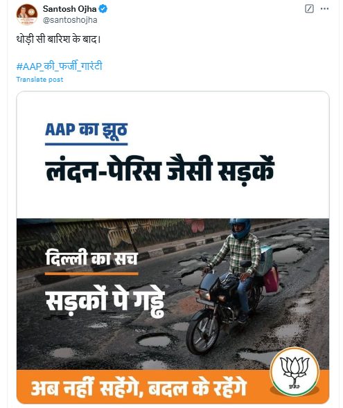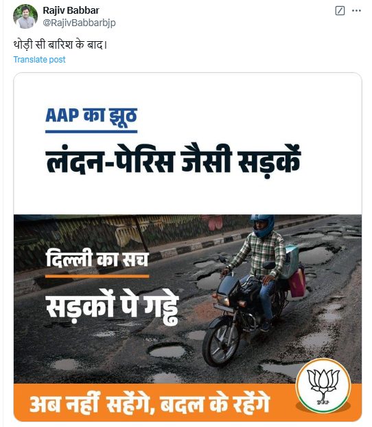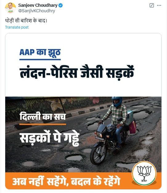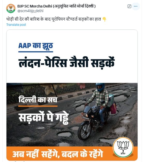 The official social media accounts of BJP Delhi, including its X handle and Facebook page, also shared the image with a caption mocking the AAP government's infrastructure claims. The caption read, "After a little rain, the condition of the roads is of European standard." (Archived link 1, link 2)