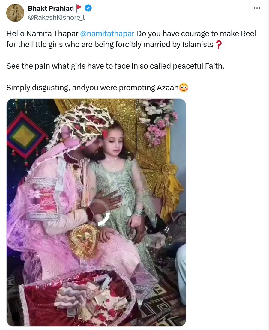 A video is going viral on social media showing a man dressed in groom’s attire sitting and speaking with a young girl, estimated to be 5–7 years old. In the clip, he is also seen kissing the child on the cheek. Several users have shared the video with communal and Islamophobic claims, alleging that a Muslim man is forcibly performing nikah (marriage) with a minor.